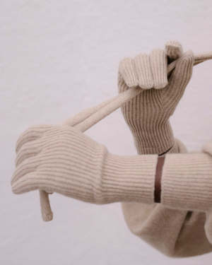 Preorder: please note, this item ships in January. Recycled cashmere rib knit gloves. 95% recycled cashmere, 5% wool. Made in France.