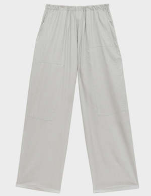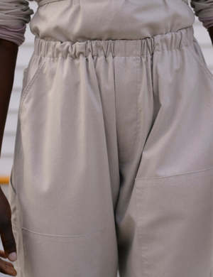 Wild silk pants from Baserange. Relaxed, straight leg with patches at the knee and pockets at the front, back, and side. Elastic waistband; pull-on style. Made in undyed raw wild silk. Details: - By Baserange - Fit: Relaxed - 100% wild silk - Made in France
