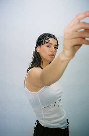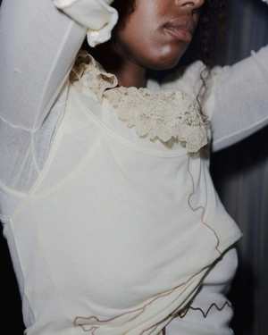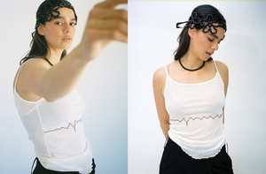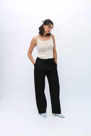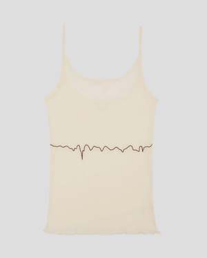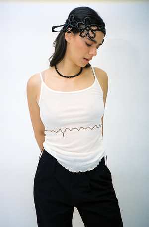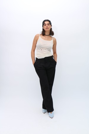 This organic cotton tank features a delicate lettuce edge at the hem and a flattering scoop neck design at the front and back, completed with thin shoulder straps. Featuring a heartline embroidery detail. It comes in its natural undyed color, showcasing its eco-friendly and sustainable essence. Styled on Joanna with Maryam Nassir Zadeh Black Abdou Trousers.