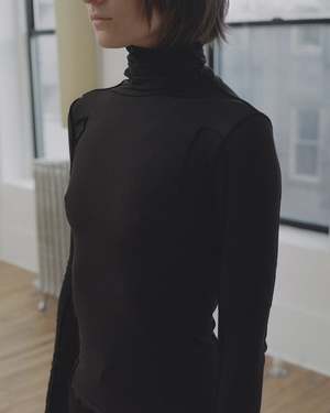 Organic cotton rib long sleeve tee Turtleneck Exposed contrast seams Lettuce edge at neckline and hems Runs small, consider sizing up 91% Organic Cotton 9% Elastane Made in Portugal