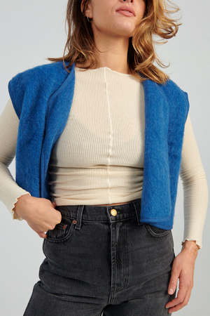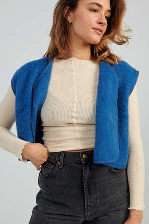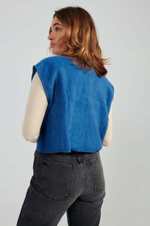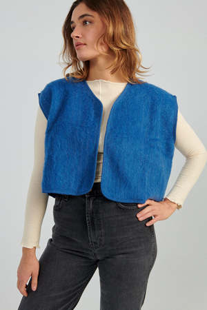 Cropped brushed wool vest with open front. Worn her with Baserange's Pama Longsleeve and B Sides Plein Jean.