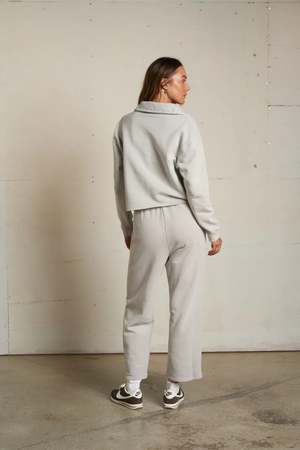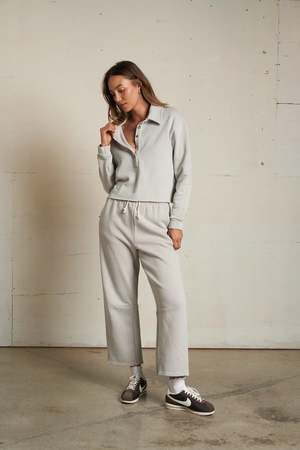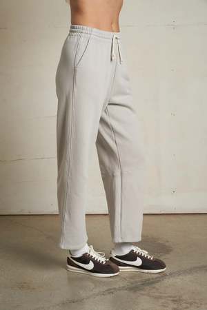The Fallon Fleece Barrel Sweatpant by basic. is made from heavy fleece and designed with side pockets, a pull-on waist with natural drawcord tie, and a barrel leg that tapers into a straight, slightly cropped finish. This versatile piece features a modern silhouette while remaining relaxed and easy to wear. Made from 100% cotton. Model is 5'9" and is wearing a size small. Inseam: 26". Front rise: XS 12 1/8", S 12 5/8", M 13 1/8", L 13 5/8", XL 14 1/8". Ethically made in California.