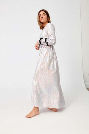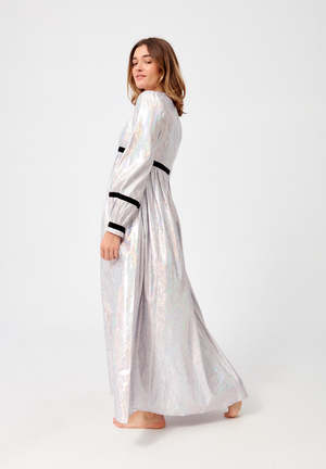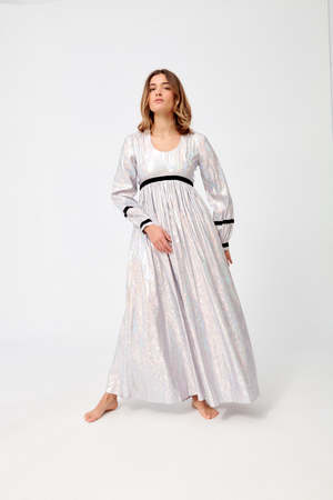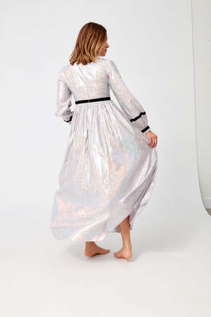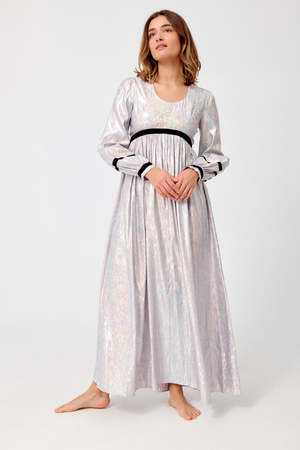 Lavender holographic lam dress with black velvet trim. The glistening holographic lam changes color as light strikes it from different angles. Features romantic balloon sleeves, an empire waist, and a pleated skirt. Designed to be slightly fitted at the bust and waist, and loose at the hip. Mid-weight, non-stretchy fabric.