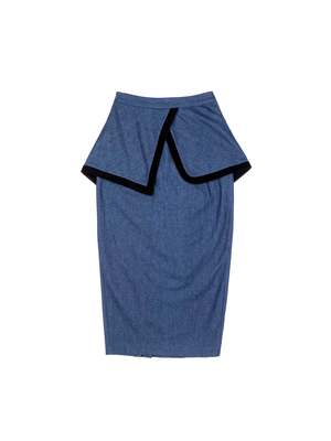 Medium-wash long denim skirt with velveteen-trimmed peplum at waist. Back of peplum goes to a V shape. Pleats on bottom in back. Back button. Style with the Ashlyn Blouse for a stunning look. Details: - 100% Cotton - Made in NYC - Model wears size 2 and is 5'10" - True to size - By BATSHEVA