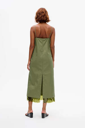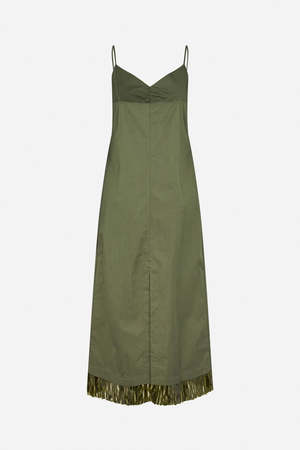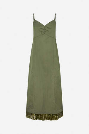 The Atelia Dress is designed in an A-shape. This maxi dress is fitted at the chest with adjustable straps, a slit at the back, and sequin detailing at the hemline. - Fitted at the chest - A-shape - Maxi length - Adjustable straps - Slit at the back - Sequin details at the hemline Material Main fabric: - 60% Organic Cotton - 40% Polyamide