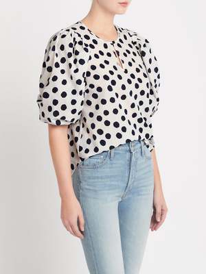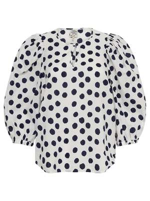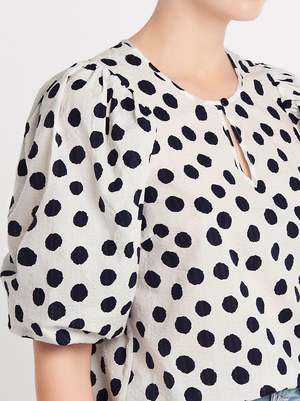 A short sleeved pop over style with puff detail, the feminie Miha Blouse from Baum Und Pferdgarten in Patriot Mega Dot is stable piece for your everyday wardrobe. The high neck is finished with a single button detail above a small keyhole opening. This tectured 100% Organic cotton piece works well styled with kick flare denim and fresh white sneakers. ---- FABRIC OR COMPOSITION The Baum Und Pferdgarten Miha Blouse in Patriot Mega Dot is made from 100% Organic Cotton ---- SIZE AND FIT The Baum Und Pferdgarten Miha Blouse in Patriot Mega Dot fits true to size Back Length: 59cm / 23.2 inches Sleeve Length: 49cm / 19.2 inchs Measurements taken from a Size 36 FR Model is wearing a Size 36 FR, Sarah is 178cm / 59 Bust 83cm / 32 1/4 in /// Waist 66cm / 26 in /// Hips 89.5cm / 25 in ---- ---- BRAND Launched in 1999 and based in Copenhagen, Baum Und Pferdgarten perfectly blends playful sensibility with edgy, laid back street style. Shop Australia's most premium range of curated, must-have pieces from Baum Und Pferdgarten and nail the cool girl chic look.