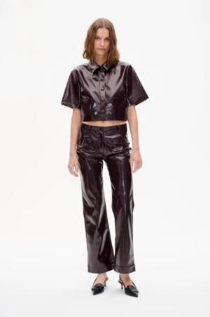 The Niella Trousers bring bold attitude with their patent-leather look. With a low waist and fitted silhouette, these bootcut trousers have a slightly flared leg for a modern feel. The faux leather trousers have subtle details such as belt loops and patch pockets with press-buttons. - Low-waist - Fitted - Bootcut - Belt loops - Patch pockets with press buttons - Faux back pocket - Zipper closure with button Model is 175cm tall, wearing size 36 (S). Main Fabric: 100% Recycled Polyester Coating: 100% Polyurethane Lining: 55% Recycled Polyester, 45% Viscose
