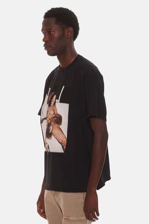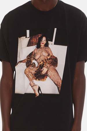 - Color: Black - Crew neck Short Sleeve Tee - Large Rihanna in leopard tight jumpsuit graphic - No graphic on back for that elevated clean look - Distressing on neck-line / sleeve hem & body hem - 100% Cotton - Machine washable recommended to wash out for that extra vintage look