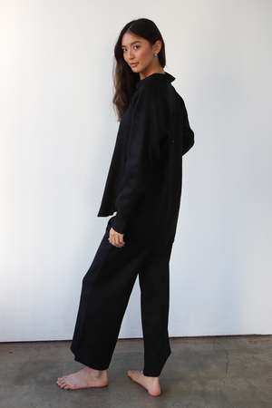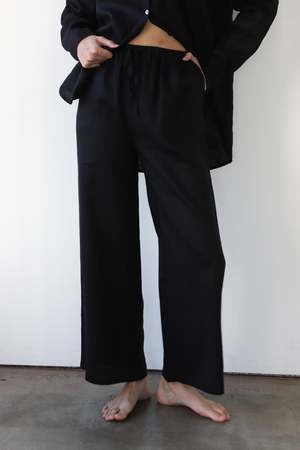 The Linen Drawstring Pant in Black is made from 100% linen. These easy pull-on pants are designed for lounging and travel, offering an effortless yet elevated feel from the airplane to the pool, hammock, or couch. Type: Pants