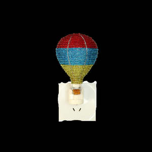 This glowing hot air balloon night light adds a soft glow to any hallway or room. - Dimensions: 3 x 5.5 x 0.5 inches - Includes rotating plug and light bulb - Hand sculpted and beaded - Beads are high quality non-fading or cracking glass and acrylic - Piece resists rust and corrosion; suitable for indoor or outdoor use