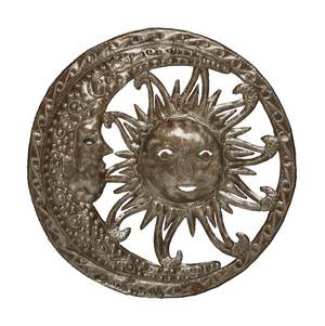 The Heavenly Bond Metal Art by Beadworx is an ancient symbol of moon and sun evoking never-ending life. Created by Paul Kensley. - Fair Trade Federation-certified steel Haitian metal art - Coated with a protective gloss varnish - Dimensions: 14" x 14" - Handcrafted at the Village Artistique de Noailles in Croix-des-Bouquets, Haiti by Haitian metal artists As each piece is handmade, slight variations add to its unique character and value.