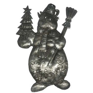 The Jolly Snowman Ornament is a handmade holiday metal art ornament, perfect for elegantly decorating your tree during the holiday season. - Fair Trade Federation-certified Haitian metal art ornament - Steel metal art coated with a protective gloss varnish - Dimensions: 8" L x 5" W - Handcrafted at the Village Artistique de Noailles in Croix-des-Bouquets, Haiti by Haitian metal artists Haitian metal art is a folk tradition that transforms recycled steel oil drums into ornate artwork. Each piece is handmade, resulting in slight variations that add to its unique character and value.