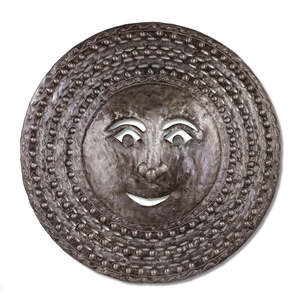 This radiant large sun wall art features hand-hammered rows of large beads encircling its design. - Fair Trade Federation-certified Haitian metal art - Crafted from recycled steel oil drums and coated with a protective gloss varnish - Dimensions: 34" x 34" - Handcrafted at the Village Artistique de Noailles in Croix-des-Bouquets, Haiti by Haitian metal artist Charles Luthern Each piece is unique due to its handmade nature, reflecting the tradition of Haitian metal art.