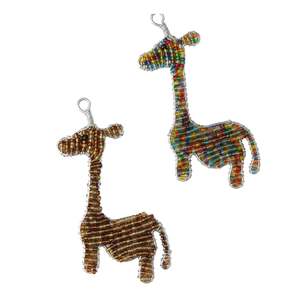 Set of 6 hand-sculpted and beaded giraffe keyrings. Each keyring measures approximately 1.5 inches long by 1.5 inches high. Made with high-quality, non-fading or cracking glass and acrylic beads. Includes "O" ring and bag clip. All dimensions are in inches.
