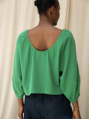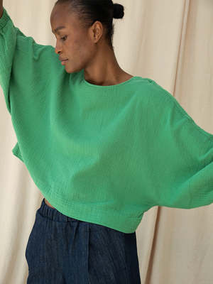 The Ivy is a beautiful, feminine, loose-fitting style. Featuring a round neck, scooped back, and batwing balloon 3/4 length sleeves with elasticated cuffs. Crafted from 100% organic cotton cheesecloth for a comfortable and soft finish. - Made from 100% GOTS Certified Organic Cotton Cheesecloth - Scooped back - Batwing balloon 3/4 length sleeves - Elasticated cuffs - Made ethically in Portugal Model is 5'10" and is wearing a size small.