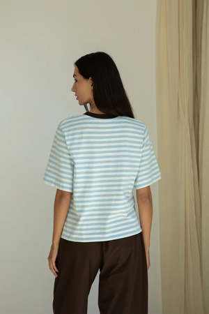 The Bay-Sue is a boxy fit T-shirt with a ribbed contrast collar, dipped hem, and intentionally wide sleeves. Ideal for layering, it is made from super soft 100% organic cotton jersey. Designed in a classic pale blue and white stripe with a contrast neckline, this softer colorway offers a playful look that pairs easily with denim, white, and rich brown tones. Ethically made in Portugal. 100% Organic Cotton Measurements: XS: Bust 36" | Sweep 36" | Center Back Length 20.5" S: Bust 38" | Sweep 38" | Center Back Length 21" M: Bust 40" | Sweep 40" | Center Back Length 21.5" L: Bust 42" | Sweep 42" | Center Back Length 22"