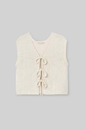 The Florence is an organic cotton-linen blend sleeveless knitted vest top with a rib-detailed hem and tie closures at the front. Perfect for wearing on its own or layering over dresses and shirts to add extra warmth and textural interest to any spring evening outfit. Ethically made in Portugal. XS: Bust 34" | Center Back Length 16.75" S: Bust 36" | Center Back Length 17.25" M: Bust 38" | Center Back Length 17.75" L: Bust 40" | Center Back Length 18.25"