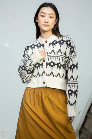The Sugi-Sue is a cropped, boxy cardigan with a button-down placket and rib knit detail at the collar, cuffs, and hem. Crafted from organic cotton yarn and finished with sustainable Corozo buttons. This version features a geometric design inspired by classic Fair Isle patterns. Designed in England and ethically produced in Portugal. Ethically made in Portugal. 100% Organic Cotton. Measurements: XS: Bust 48" | Sweep 38" | Center Back Length 18.75" S: Bust 50" | Sweep 40" | Center Back Length 19.25" M: Bust 52" | Sweep 42" | Center Back Length 19.75" L: Bust 54" | Sweep 44" | Center Back Length 20.25"