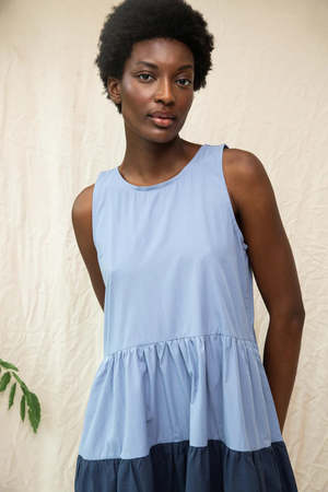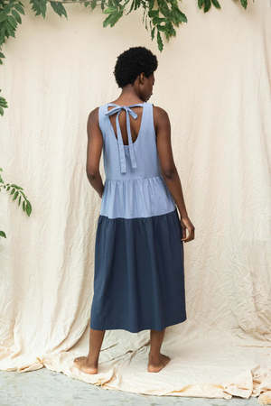 The Noelle dress is a sleeveless, tiered midi dress with a loose cut A-line body. It features a low scoop back with a tie at the back neck and side pockets at the hip. Crafted from 100% organic cotton poplin for a crisp, cool feel.
