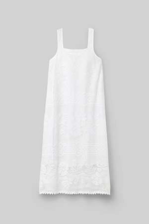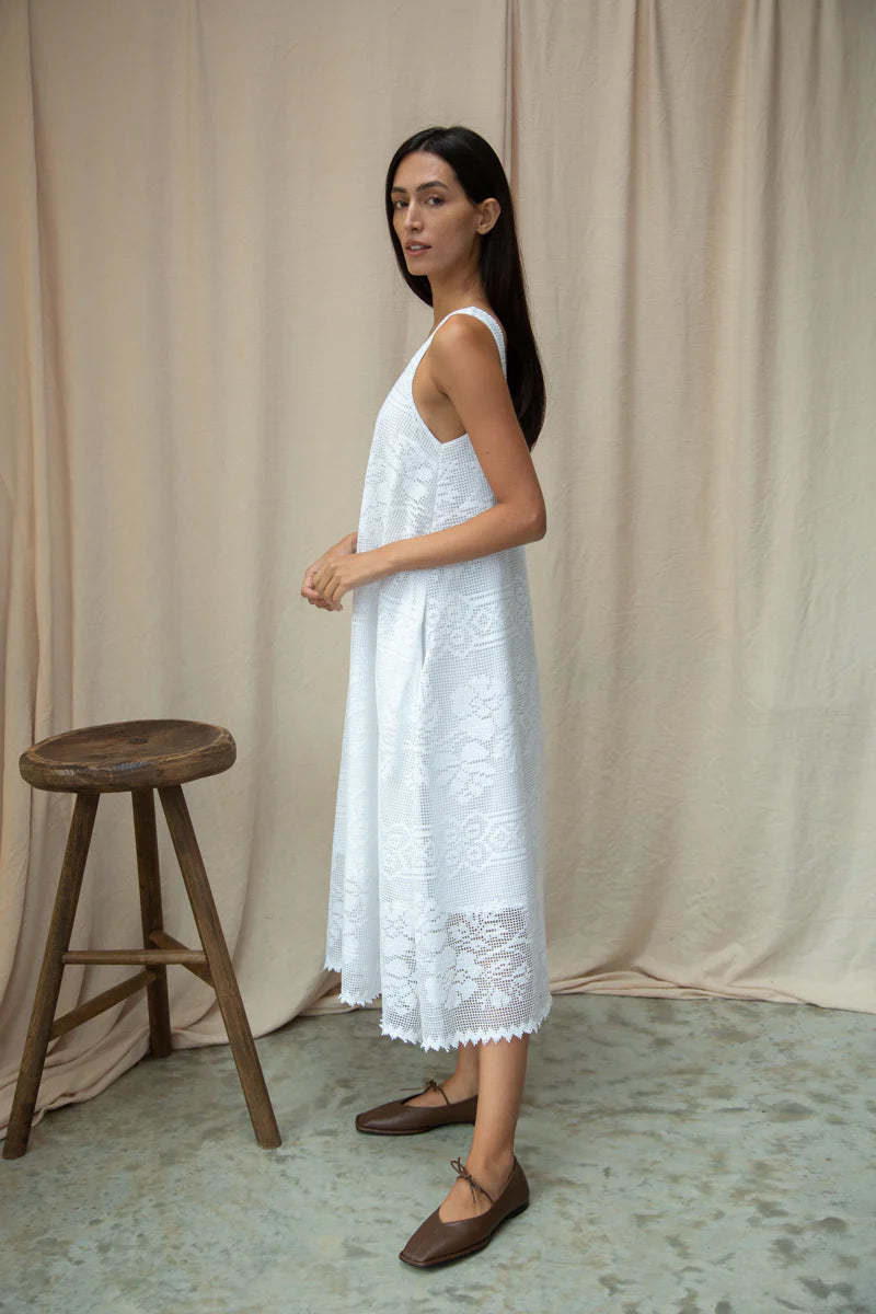 The Freya-Fay midi dress is crafted from organic cotton lace with a 100% organic cotton poplin lining. It features a square neckline, side pockets, delicate edging detail on the hem, and a sleeveless silhouette. Ethically made in Portugal. Lace: 80% Organic Cotton, 20% Polyester Lining: 100% Organic Cotton Measurements: XS: Bust 36" | Waist 42" | Center Back Length 40.5" S: Bust 38" | Waist 44" | Center Back Length 41" M: Bust 40" | Waist 46" | Center Back Length 41.5" L: Bust 42" | Waist 48" | Center Back Length 42"