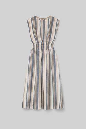 Crafted from woven GOTS-certified organic cotton, the Ottillie-May Dress features a boxy sleeveless bodice that blouses into a shirred waistband, with an A-line skirt and side-seam pockets. It is easy to dress up or down, making it ideal for travel and a versatile summer wardrobe staple that can be layered under knits and jackets into fall. Ethically made in Portugal. 100% Organic Cotton Measurements: XS: Bust 28" | Waist (relaxed) 22" | Center Back Length 45" S: Bust 30" | Waist (relaxed) 24" | Center Back Length 45.5" M: Bust 32" | Waist (relaxed) 26" | Center Back Length 46" L: Bust 34" | Waist (relaxed) 28" | Center Back Length 46.5" Smocking at the waist will stretch to fit true to size, up to approximately 6" from the listed relaxed measurements.