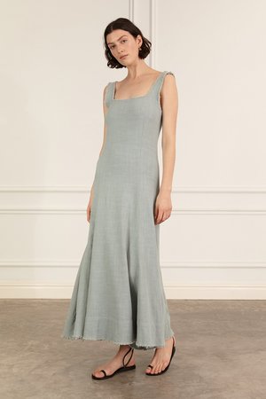The Anouk Dress first featured in our Spring 18 collectsion. It is a beautifully elegant silhouette to take you through the seasons. It features a feminine square neck at the front and back and is fitted through the chest and waist then falls into a voluminous skirt. All edges are left raw. The dress features a centre back invisible zipper fastening. Model wears size 8. Fit to be tight over the chest and waist, this fabric does give and soften with wear. Please see key measurements below: Chest at under arm point (in cms when flat): 6/37.5 8/40 10/42.5 12/45 14/47 Total length (including straps): 6/127 8/129 10/131 12/133 14/135 55% Cotton / 45% Linen Cold machine wash with a gentle detergent. Line dry in shade. Do not wring.