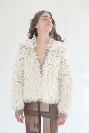 Luxurious hand knit cardigan with a faux-fur shaggy exterior. Exceptionally soft, made from baby alpaca and organic cotton blended yarns. Features large silver snaps down the front, a collared neckline, and double ribbed cuffs and hem. Oversized one-size fits all fit, accommodating sizes 0-10. Warm and substantial enough to be worn as your go-to winter jacket. Total length: 20" Made in Peru.