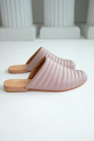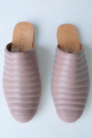 Ultra comfortable, easy all-day-wearable flat slides. Luxurious soft ribbed leather. Running true to size. 100% leather and leather lined. We love the color orchid. Color feels great, and works like a neutral with just the right about of grey. Made fairly in Peru.