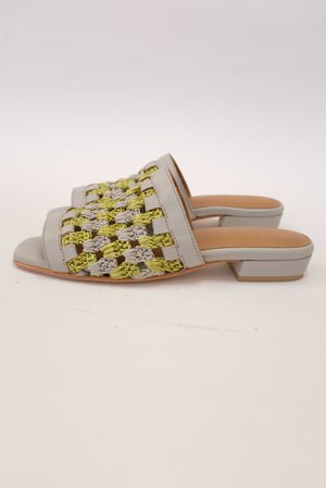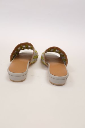 Hand crafted, crocheted, 100% leather upper with raffia detailing. Spongy padded insole for extra comfort. Leather wrapped 3 / 4 inch heel. Running true to size. Easy slide on everyday shoe. Made by hand with love in India.