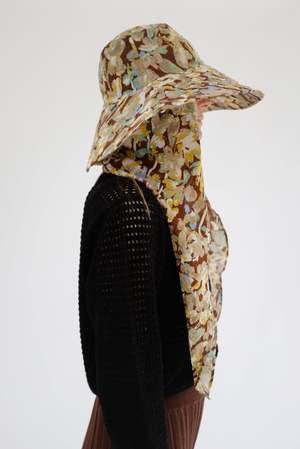100% Japanese cotton sunhat in a brown floral print. Provides great shade for the face. One size fits most, with a scarf tie for windy weather, extra shade, or privacy. Wear tied or untied. Holds a lot of hair, or hair can be worn free. Versatile sash that ties in front or in back. Brim can be flipped up or down, in front or back. Throw in your suitcase or leave in your car; it takes up almost no room and travels well. Offers great sun protection. Made in California.