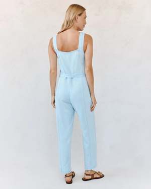 The Square Neck Jumpsuit is a sleek one-piece designed to feel polished and effortlessly put-together. It features a clean, structured square neckline that highlights the collarbone, a classic button-front closure that enhances the silhouette, a sleeveless design for refined, versatile layering, a belted waist tie for adjustable, flattering definition, and a full-length slim pant for an elongated, tailored finish and sophisticated look. DESIGNER ID: B6201-F85-616 COLOR: COASTAL COMPOSITION: 100% Lenzing Tencel Lyocell CARE: Machine wash cold. FIT: Runs true to size. Imported.