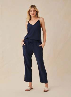 The Smocked Waist Trousers by Bella Dahl are an elegant and comfortable option for any occasion. Made from soft TENCEL Lyocell fabric, these trousers feature side pockets for convenience and a relaxed fit for effortless style. Pair them with a blouse for a sophisticated look or with a t-shirt for a more casual outfit. Details: - Mid-rise elastic smocked waist with drawstring - Slightly cropped straight legs - Side pockets - Color: Endless Sea (navy blue) - True to size The model is 5'10" and wears size XS. - 100% TENCEL Lyocell - Machine wash cold