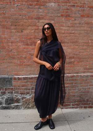 Double-layered draped skirt with a thick cotton jersey waistband, gathered draping, and elasticated bubble hem. 100% Silk Waistband: 47.25% Cotton, 47.25% Modal, 5.5% Spandex.