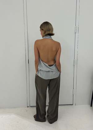 Draped halter top with an asymmetric V-neckline, open low back, and soft layered drape through the body. Finished with a self-tie hem that can be cinched to create a bubble effect or worn loose for a straight fit. Marinet is 59, wears an XS and has a 35 bust and a 26 waist. 79% Cellulose Fiber, 21% Mulberry Silk.