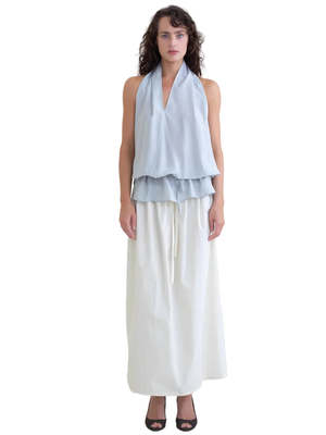 Draped halter top with asymmetric V-neckline, open low back, and soft layered drape through the body. Finished with a self-tie hem that can be cinched to create a bubble effect or worn loose for a straight fit. 79% Cellulose Fiber, 21% Mulberry Silk Measurements (in) XS S M L XL Chest: 40 42.5 45 47 49.5 Front Middle Length: 34 34.5 34.5 35 35.5 Hem Circumference: 44 46.5 49 51 53.5