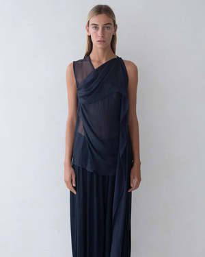 Asymmetric tunic with extended cascading panel, sleeveless construction, dual button-closure, and multiple wear options. Made from 100% silk. True to size, take your usual size. Dry clean only recommended. For a gentle refresh, hand wash in cold water with a mild detergent. Avoid machine washing, soaking, or harsh chemicals. Do not wringgently press out excess water and reshape. Lay flat or hang to dry away from direct sunlight.