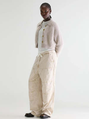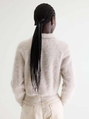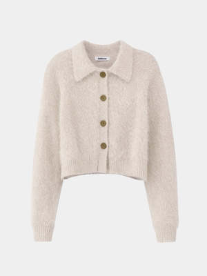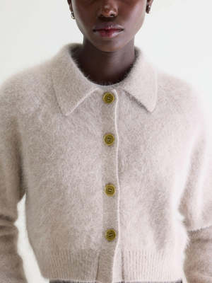 The Bellerose Dacto Cardigan features a relaxed, cropped angora-blend knit with a button-front closure and spread collar. - 65% Angora / 35% Polyamide / Nylon - Relaxed fit - Cropped length - Button-front closure - Long sleeves - Spread collar - Ribbed hem and cuffs - Soft angora blend - Medium gauge - Made in China