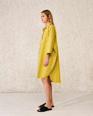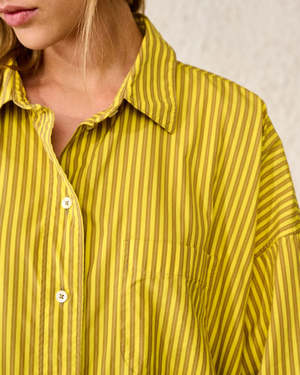 BELLEROSE Gladys Dress in Stripe V. Three quarter sleeves, a button front closed by mother of pearl buttons, and a high low hem that recalls classic shirts, Gladys is relaxed and oversized cut makes for an effortless and versatile piece that you'll enjoy on many occasions. Wear it with a simple pair of sandals or layer it over a pair of pants for a studied look. - Oversized shirt-dress - 100% cotton - Patch chest pocket - Concealed side pockets - High low curved hem