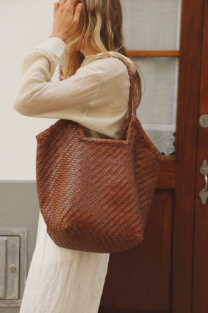 The Selene Tote Bag by Bembien is crafted from vegetable-tanned cowhide leather that develops a beautiful, vintage-feeling patina over time. Each piece is handwoven by artisan weavers and takes up to eight days to complete. Made in India. 100% Leather (Cow) Height: 16" (40.6 cm) Width: 17" (43.8 cm) Depth: 8" (20.3 cm) Handle Length: 11" (28 cm) Closure: Open MPN: 810182435183.