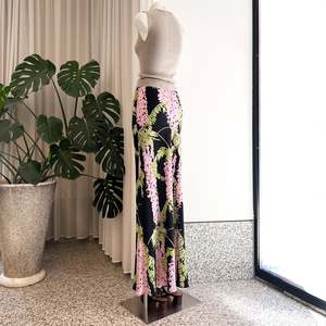 BERNADETTE's Emily extra long skirt is bias cut for an untra flattering fit and has a drawstring waist. It features the brand's pink wisteria print allover and is cut from soft silk. Made in Portugal from Italian fabric. 100% Silk. Length: 119 cm. Waist: 84 cm. Hips: 88 cm. (Measurements for size 36, on mannequin). Bernadette Antwerp is the creation of Belgian mother and daughter duo, Bernadette and Charlotte de Geyter. Their minimalist but ultra feminine designs are known for their volumes, colors and flower prints, painted by hand by Charlotte herself and then printed of the finest Italian fabrics.
