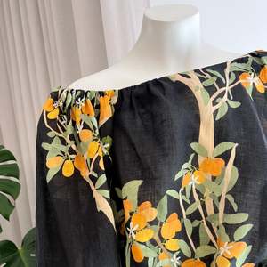 The Raquel Top by BERNADETTE is an asymmetric off-the-shoulder blouse with voluminous sleeves and body, featuring the brand's exclusive kumquat all-over print. Made in Romania from Italian fabric. 66% Cotton, 34% Linen. This style runs true to size.