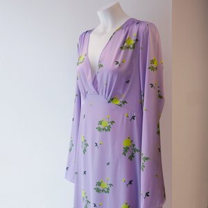Floral print, stretch silk, midi dress with a draped V-neckline and long kimono sleeves. Slips on, no closure. Made in the EU. 95% silk, 5% elastane. Designed for a relaxed, loose fit, it runs slightly large. Size 36, on mannequin. Bernadette Antwerp is the creation of Belgian mother and daughter duo, Bernadette and Charlotte de Geyter. Their minimalist but ultra feminine designs are known for their volumes, colors and flower prints, painted by hand by Charlotte herself and then printed of the finest Italian fabrics. - Styled here with MARI GIUDICELLI LUIZA SANDAL CALF IN BLACK.