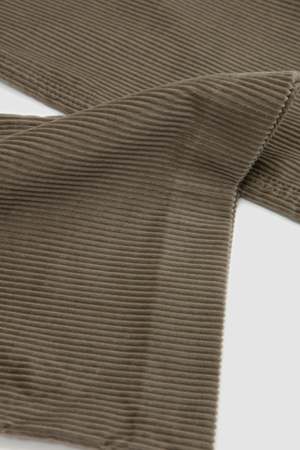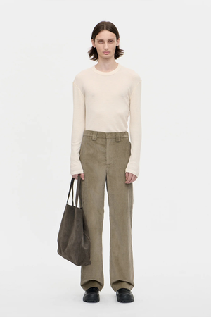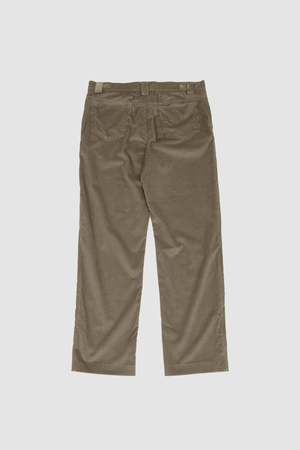 Night Trouser produced in a deadstock Italian cotton/cashmere corduroy fabric. Features a straight leg, wide belt loops, and patch back pockets. The fabric has a flowy drape and a very soft hand.