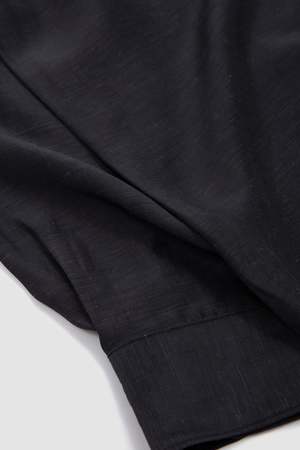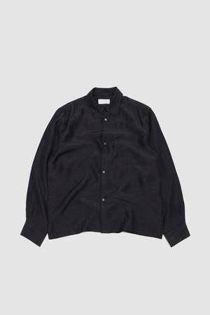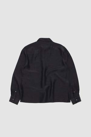 The Dinner Shirt Open is made in a Japanese drapey acetate/linen blend. The Dinner Shirt is slightly fitted and features dark grey real mother-of-pearl buttons and a subtle curved hem.