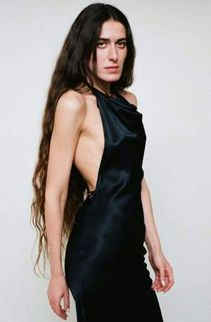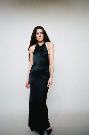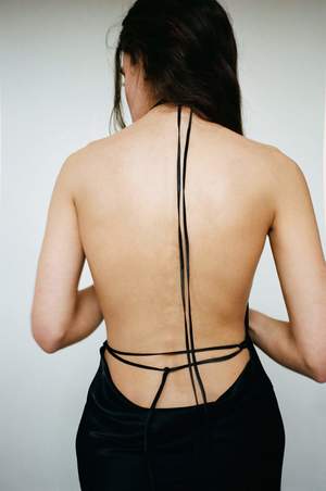 Esther wears the Abla Dress in Black. This dress features an open back with exaggerated lengthy ties that have a crocheted finished detail. This dress is ankle length, feels and looks like medium-weighted silk but is made of viscose. This piece follows the intention of the brand Bevza, known for their creations of strong silhouettes that play on more classic ideas of wear. Made in Kyiv. Esther is 5'9" tall and measures 32 bust, 26.5 waist, and 35 hips and wears a size XS. Fabric is 100% Viscose.