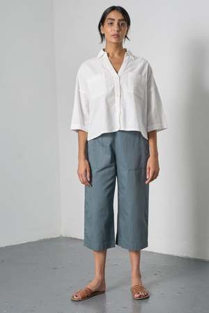 The Anna Culottes feature a flattering wide-leg silhouette with a side button closure and intentionally cropped length. They sit neatly at the low waist with a relaxed rise and are finished with an elasticized back waistband for an easy fit and carpenter-style pockets for added practicality. The striped slate cotton twill serves as a playful neutral to pair with summer tops and sweaters. Made in India at a Fair Trade cooperative. 100% Cotton Measurements: XS: Waist 27.75" | Rise 11" | Inseam 20.5" S: Waist 29.75" | Rise 11" | Inseam 20.5" M: Waist 31.75" | Rise 11" | Inseam 20.5" L: Waist 33.75" | Rise 11" | Inseam 20.5"