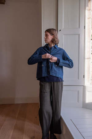 Crafted from 11 oz indigo dyed denim, this jacket was washed for softness and has a lived-in ease from day one. Tailored to sit neatly on the shoulders with a clean, structured shape. Fastened with classic brass tack buttons for a workwear feel and finished with two deep patch pockets and full-length sleeves. A timeless layer with purpose: built to last, made with intention. Designed in the United Kingdom and made by Fair Trade Certified Partners in India. Made in India 100% Cotton Denim Measurements: XS: Bust 39" | Sweep 44" | Center Back Length 22.5" S: Bust 41" | Sweep 46" | Center Back Length 23" M: Bust 43" | Sweep 48" | Center Back Length 23.5" L: Bust 45" | Sweep 50" | Center Back Length 24"
