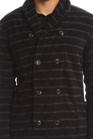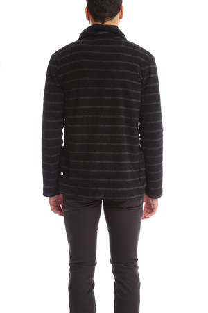 Uniquely fabricated in a Terry cloth like cotton blend with an English fit with shorter arms, a crossover double breasted closure, all in a specially designed pile fabric which makes the garment softer and more fluffy. - Color: Black with Horizontal Grey Stripe - Fabric: 100% Rayon - Style #: 26139 - Made in Vietnam - Hand Wash Cold * Model is 6'1" wearing size 48 Productcode BHY5-3 Designer biography