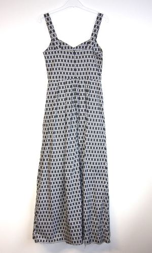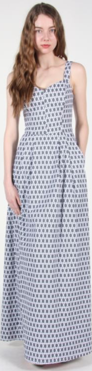 Babbler was our first ever maxi dress! It is fully lined, has pockets in the front skirt and closes with a back invisible zipper. Special Notes: Excellent condition! Finished measurements are: Bust - 34" Waist - 26" Hips - 50" Shoulder to hem - 56.5" You can see our size chart here. Shell: 100% cotton Lining: 100% cotton Care: Hand wash cold, hang to dry. Made in Canada.