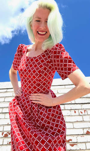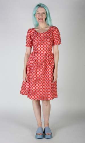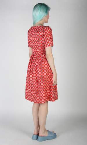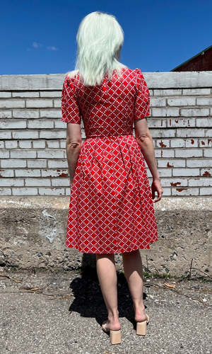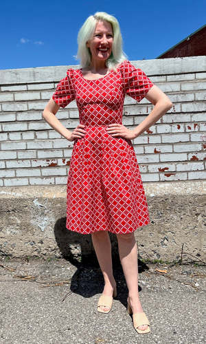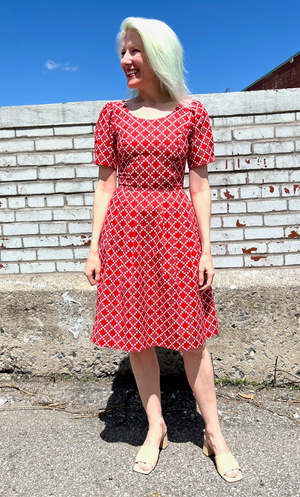 PLEASE NOTE: This style is on pre-order only right now. We're expecting it to arrive in the third week of April, 2024. Winter Chippy is back in gorgeous new cotton prints! It has our classic fit and flare cut, with pleats at the waist, and front skirt pockets, and a back invisible zipper closure. It is also available in Navy Village Toile, Brick Village Toile and Have a nice day! This vibrant red print is a beautiful 100% cotton deadstock, and the skirt is lined in soft satin that is 96% polyester and 4% spandex. Winter Chippy can be hand or machine washed on a cold, delicate cycle and hung to dry. Hayley is 5'7" and wears our size 6. Winter Chippy measures 39"(2) to 42"(20) from shoulder to hem - you can see our size chart here. Everything at Birds of North America is vegan and has been made ethically in Canada since we began in 2007. We have a strong focus on sustainability, and strive to create high-quality garments that last a long time. You can browse vintage Birds styles that we've gathered back as part of our buyback program in our ReNesting section! Red Patches